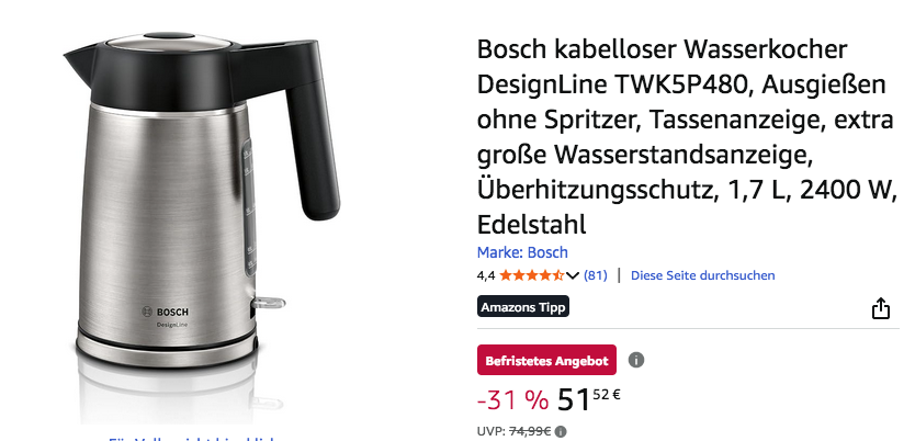 Amazon Kunden haben diesen schönen Wasserkocher mit 4,4 Sternen benotet (81 Bewertungen).