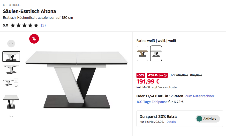Den OTTO HOME Säulen-Esstisch Altona in Weiß bekommt man im Laufe dieser Aktion für 191,99€ zzgl. 39,95€ Versand.