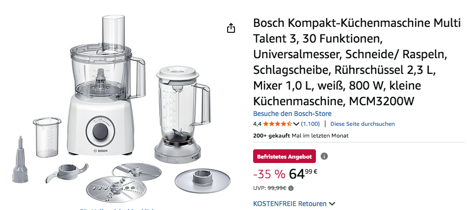 Amazon bietet aktuell die Bosch MultiTalent 3 MCM3200W Kompakt-Küchenmaschine für 64,99€ an, solange der Vorrat reicht.