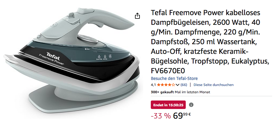 Amazon bietet aktuell das Tefal FV6670E0 Freemove Power kabellose Dampfbügeleisen für 69,99€ an, solange der Vorrat reicht.