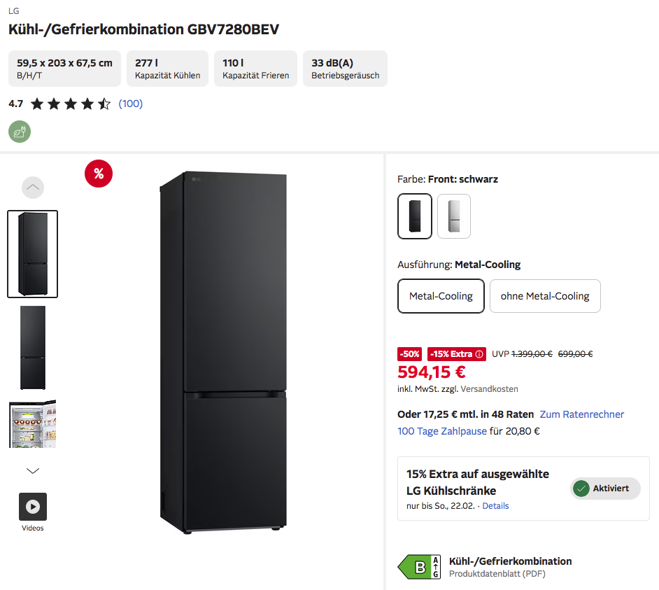 Otto.de bietet bis 22.02.2026 einen 15% Rabatt auf ausgewählte LG Kühlschränke des Verkäufers OTTO an, solange der Vorrat reicht.