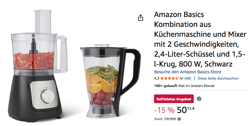 Amazon bietet aktuell die Amazon Basics Kombination aus Küchenmaschine und Mixer mit 2 Geschwindigkeiten für 50,15€ an, solange der Vorrat reicht.