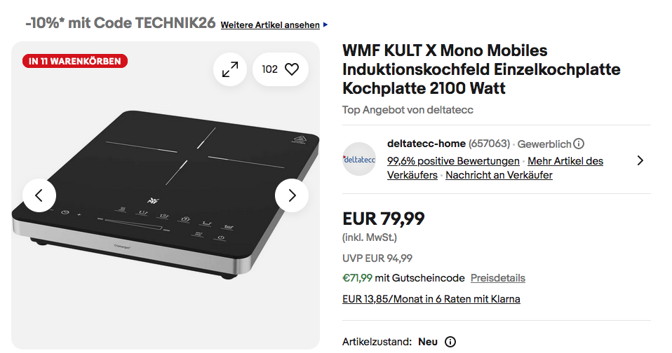 Dank dem Gutscheincode: TECHNIK26 (10% Rabatt auf ausgewählte Elektronik & Haushaltsgeräte) bekommt man diese mobile Kochplatte für 71,99€ inkl. Versand.