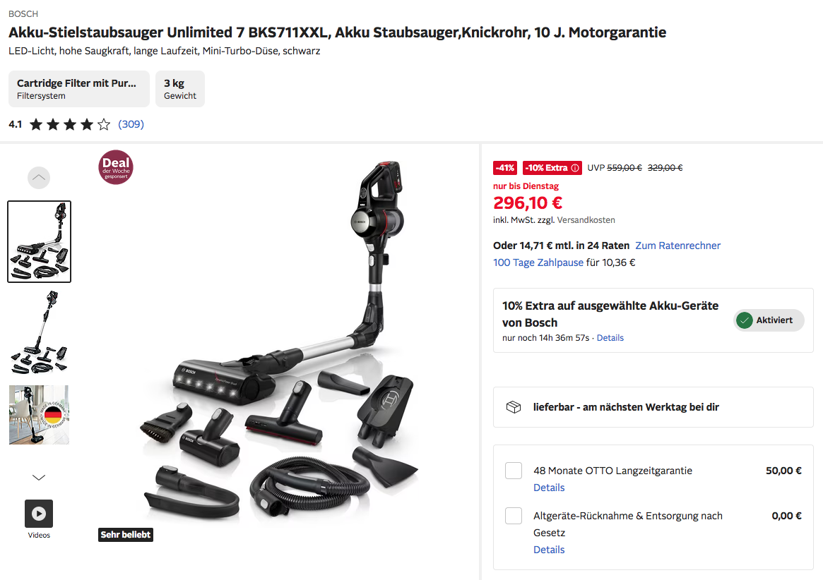 Den BOSCH Akku-Stielstaubsauger Unlimited 7 BKS711XXL bekommt man im Laufe dieser Aktion für 296,10€ zzgl. 4,95€ Versand.