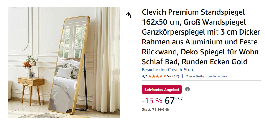 Amazon bietet aktuell den Clevich 162x50 cm Premium Standspiegel mit Runden Ecken Gold für 67,13€ an, solange der Vorrat reicht.