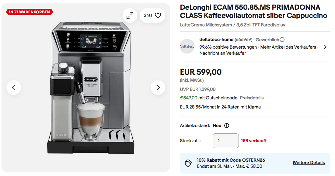 Den DeLonghi ECAM 550.85.MS PRIMADONNA CLASS Kaffeevollautomat NEU&OVP bekommt man im Laufe dieser Aktion für 549€ inkl. Versand.