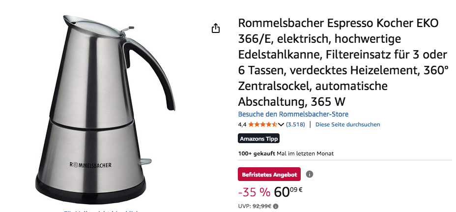 Amazon bietet aktuell den Rommelsbacher Espresso Kocher EKO 366/E für 60,09€ an, solange der Vorrat reicht.