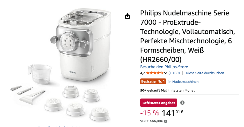 Amazon bietet aktuell die Philips Nudelmaschine Serie 7000 in Weiß HR2660/00 für 141,01€ an, solange der Vorrat reicht.
