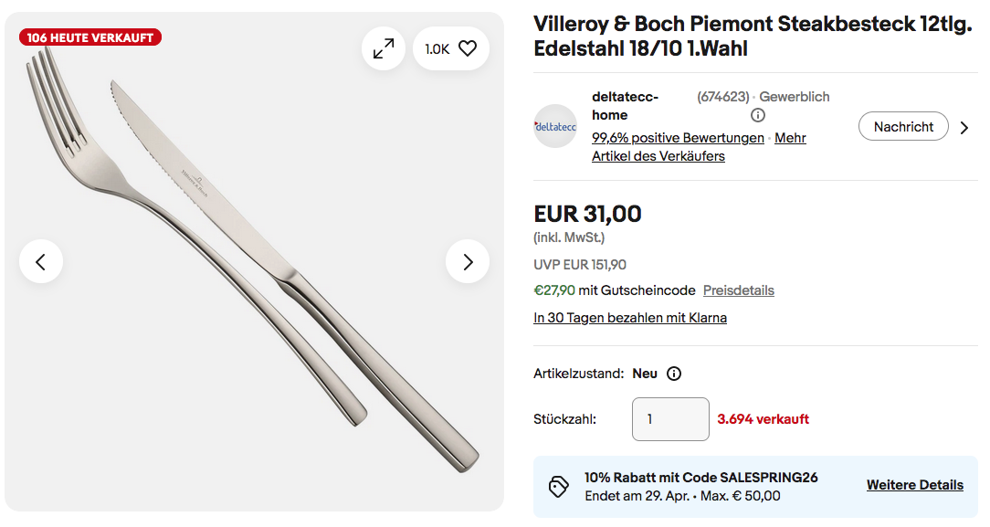 Dank dem Gutscheincode: SALESPRING26 (bis zu 20% Rabatt auf ausgewählte Artikel) bekomm man dieses elegante Steakbesteck für 27,90€.