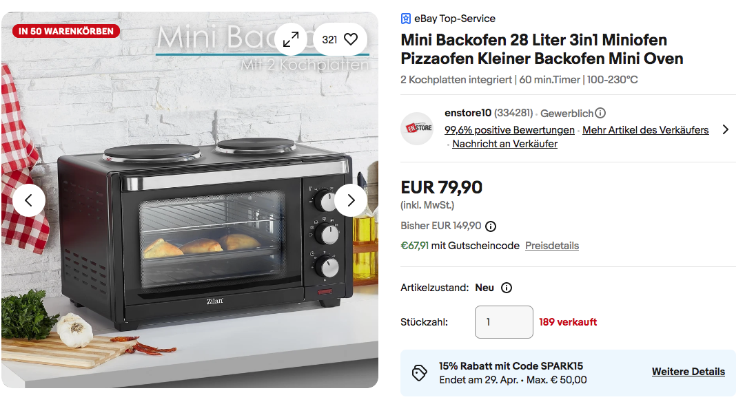 Dank dem Gutscheincode: SPARK15 (15% Rabatt auf ausgewählte Artikel) bekommt man bis 29.04.26 bei eBay den Zilan 3in1 Mini Backofen mit 2 Kochplatten NEU&OVP für 67,91€ inkl. Versand, solange der Vorrat reicht.