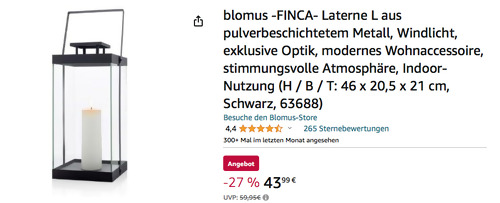 Amazon bietet aktuell ausgewählte Produkte für die Heimdekoration billiger an, solange der Vorrat reicht. Die Blomus FInca 63688 Laterne L bekommt man im Laufe dieser Aktion für 43,99€. Maße: H 57.5 cm, B 20,2 cm, T 20,2 cm Material: Stahl Pulverbeschichtet, Glas Indoor-Nutzung Exklusive Kerze Amazon Kunden haben diese schicke moderne Laterne für Schlaf- oder Wohnzimmer mit sehr guten 4,4 Sternen benotet (131 Sternebewertungen).