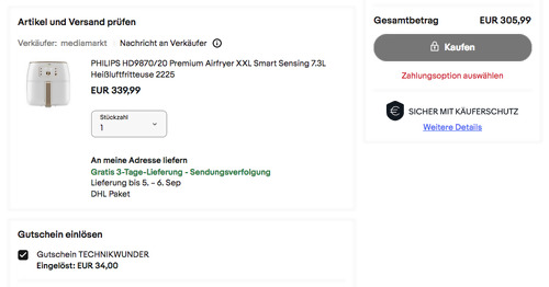 Dank dem Gutscheincode: TECHNIKWUNDER (zur Kasse gehen und dort einlösen) bekommt man bei eBay bis zum 13.9.23 einen 10% Rabatt (2x einlösbar max. 50€) auf ausgewählte Technik, solange der Vorrat reicht. Die PHILIPS HD9870/20 Premium Airfryer XXL Smart Sensing 7.3L Heißluftfritteuse in Weiß NEU&OVP bekommt man im Laufe dieser Aktion für 305,99€ inkl. Versand an, solange der Vorrat reicht. Vielseitig: Frittieren. Backen. Grillen. Braten. Und sogar Aufwärmen! XXL-Familiengröße für ein ganzes Hähnchen oder 1,4 kg Pommes frites Füllmenge Fritierkorb: 7.3 l Praktische Warmhaltefunktion und Speichern Ihrer bevorzugten Einstellungen Die Fat Removal Technologie fängt überschüssiges Fett auf Smart Chef-Programme für beliebte Gerichte QuickClean und spülmaschinenfest für alle abnehmbaren Teile Maximale Temperatur: 200 °C Maximale Leistung: 2225 Watt Diese intelligente Heißluftfritteuse für den täglichen Einsatz wurde von Amazon Kunden mit sehr guten 4,4 Sternen benotet (183 Sternebewertungen).