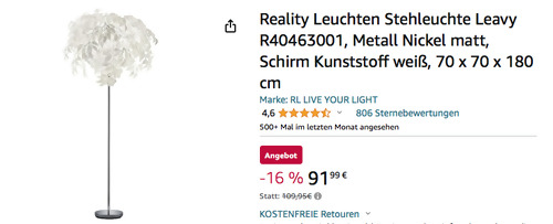 Amazon bietet aktuell ausgewählte Beleuchtung von Trio und Reality Leuchten billiger an, solange der Vorrat reicht. Die Reality Leuchten R40463001 Stehleuchte Leavy in Weiß bekommt man im Laufe dieser Aktion für 91,99€. Stehleuchte Leavy 3-flammig Metall Chrom mit Kunststoff-Blättern in der Farbe Weiß Der Schirm hat einen Durchmesser von 70cm, die Gesamthöhe beträgt 180cm Passendes Leuchtmittel 3x E14 max. 28 Watt Kein Leuchtmittel im Lieferumfang enthalten Amazon Kunden haben diese ausgefallene Stehleuchte mit sehr guten 4,7 Sternen benotet (365 Sternebewertungen).