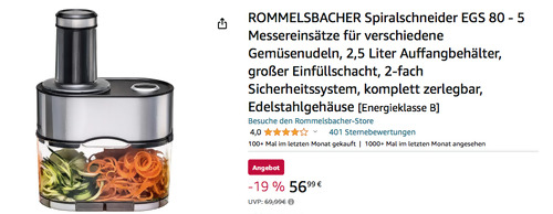 Amazon bietet aktuell ausgewählte Küchengeräte von Rommelsbacher billiger an, solange der Vorrat reicht. Den ROMMELSBACHER Spiralschneider EGS 80 bekommt man im Laufe dieser Aktion für 56,99€. 5 Messereinsätze für unterschiedliche Formen und Breiten: Tagliatelle (8, 5 mm), Linguine (6 mm), Spaghetti (3 mm), Streifenspiralen glatt oder gerippt (bis 30 mm) Pflegeleichtes Edelstahl-Gehäuse, extra großer 2,5 Liter Auffangbehälter aus BPA-freiem Kunststoff Abnehmbaren Teile spülmaschinengeeignet, platzsparende Aufbewahrung des Zubehörs im Behälter inklusive Reinigungsbürste Leistung: 100 Watt Amazon Kunden haben diesen elektrischen Spiralschneider für Gemüse-Nudeln und Salate mit 4 Sternen bewertet (401 Sternebewertungen).