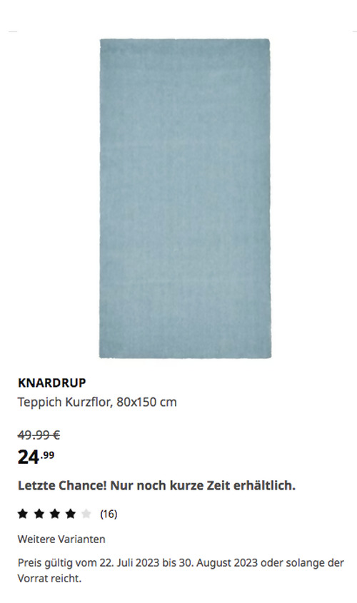 KNARDRUP Teppich Kurzflor, hellblau, 80x150 cmAngebot gilt bis 30. August 2023 bei IKEA Kassel, gilt nicht für einen Kauf über Click & Collect und solange der Vorrat reicht.