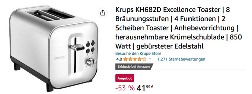 Amazon bietet aktuell ausgewählte Krups, Tefal und Rowenta Küchen- und Haushaltsgeräte billiger an, solange der Vorrat reicht. Den Krups KH682D Excellence 2 Scheiben Toaster bekommt man im Laufe dieser Aktion für 41,99€. Zwei-Scheiben Toaster mit Toastschlitzen variabler Breite 8 Bräunungsstufen für individuelle Toastergebnisse 4 Funktionen mit beleuchteten, berührungsempfindlichen Tasten: Stopp, Auftauen, Aufwärmen und Bagel Anhebevorrichtung Einfach herausnehmbare Krümelschublade zum praktischen Reinigen Material: Edelstahl Leistung: 850 Watt Amazon Kunden haben diesen eleganten Toaster mit sehr guten 4,4 Sternen benotet (348 Sternebewertungen).