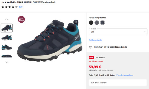 Otto.de bietet bis 03.08.2023 mit dem Gutscheincode: 13932 einen 20 % Rabatt auf ausgewählte Strandmode und Schuhe des Verkäufers OTTO an, solange der Vorrat reicht.Beispiel Warenkorb:Den Jack Wolfskin TRAIL HIKER LOW W Damen Wanderschuh in verschiedenen Farben und Größen (37-43) bekommt man im Laufe dieser Aktion für 47,99€ zzgl. 2,95€ Versand. Vielseitiger Wanderschuh von Jack Wolfskin Langlebiges Obermaterial aus Leder und Textil Genügend Grip und fester Halt auf verschiedenen Untergründen Verschluss: Schnürung Schuhhöhe: niedrig