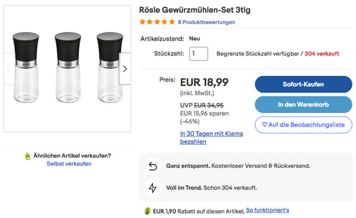 Casa-living bietet aktuell bei eBay das 3-teilge Rösle Gewürzmühlen-Set NEU&OVP für 18,99€ inkl. Versand an, solange der Vorrat reicht. Dank dem Gutscheincode: FRISCHE23 (10% Rabatt auf ausgewählte Artikel aus der Kategorien Schlafzimmer, Wohnzimmer und Küche) bekommt man diese stilvolle Gewürzmühlen-Set für 17,09€ inkl. Versand. 1x Pfeffermühle 1x Salzmühle 1x Gewürzmühle Glas 120ml mit Mühle spitzenklasse Keramikmahlwerk Einfache Einstellung des Mahlgrades von fein bis grob Große Öffnung zum einfachen Befüllen Diese hochwertige Salz-/Pfeffermühlen wurden von Amazon Kunden mit sehr guten 4,8 Sternen benotet (78 Sternebewertungen).