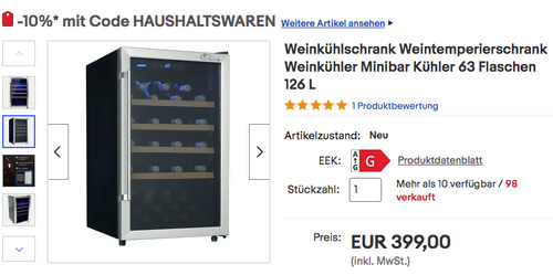 Dank dem Gutscheincode: HAUSHALTSWAREN (zur Kasse gehen und dort einlösen) bekommt man bei eBay bis zum 02.08.2023 einen 10% Rabatt (2x einlösbar und max. 50€) auf ausgewählte Haushaltsgeräte, solange der Vorrat reicht. Den TroniTechnik TT-3952 126 L Weinkühlschrank für 63 Flaschen NEU&OVP bekommt man im Laufe dieser Aktion für 359,10€ inkl. Versand. Elegante Optik dank Panoramafenster und Aluminiumrahmen Stauraumvolumen von 126 Litern für 63 Flaschen Temperaturregulierung von 5°C bis 18°C Starke LED-Beleuchtung im Innenraum Vier herausziehbare Einleger mit Holzfront Höhe: ca. 85 cm Breite: ca. 50 cm Tiefe: ca. 57,5 cm Energieeffizienzklasse: G
