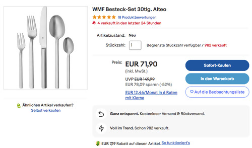 Dank dem Gutscheincode: FRISCHE23 (zur Kasse gehen und dort einlösen) bekommt man bei eBay bis zum 02.08.2023 einen 10% Rabatt (2x einlösbar und max. 50€) auf ausgewählte Artikel aus der Kategorien Schlafzimmer, Wohnzimmer und Küche, solange der Vorrat reicht. Das 30-teilige WMF Besteck-Set Alteo NEU&OVP bekommt man im Laufe dieser Aktion für 64,71€ inkl. Versand an, solange der Vorrat reicht. 6x Menülöffel 6x Menügabel 6x Tafelmesser 6x Kaffeelöffel Edelstahl 18/10 mattiert Dieses moderne und elegante Besteck-Set für 6 Personen wurde von Amazon Kunden mit sehr guten 4,4 Sternen benotet (265 Sternebewertungen).