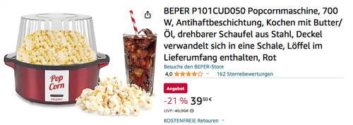 Amazon bietet aktuell ausgewählte Küchengeräte billiger an, solange der Vorrat reicht. Die BEPER P101CUD050 700 Watt Popcornmaschine in Rot bekommt man im Laufe dieser Aktion für 39,30€. Bis zu 75 Gramm leckeres Popcorn in 5 Minuten Transparenter Deckel verwandelt sich in eine große Schüssel Drehbarer Schaufel aus Stahl Antihaftbeschichtung Löffel im Lieferumfang enthalten Leistung: 700 Watt Amazon Kunden haben diese mit 4 Sternen bewertet (162 Sternebewertungen).