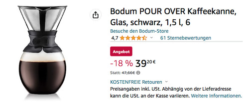 Amazon bietet aktuell ausgewähltes Geschirr billiger an, solange der Vorrat reicht. Die Bodum POUR OVER 1,5 Liter Kaffeekanne in Schwarz bekommt man im Laufe dieser Aktion für 39,20€. Heißes Wasser wird langsam und gleichmäßig über dem Kaffeepulver verteilt – das Aroma kann sich besser entfalten Kapazität: 1,5 Liter Permanentfilter aus Edelstahl Die Kanne ist aus geschmacksneutralem Borosilikatglas hergestellt Die abnehmbare Manschette schütz die Hände vor heißem Glas Amazon Kunden haben diesen hochwertigen Filterkaffeebereiter für reinen Kaffee mit sehr guten 4,7 Sternen benotet (61 Sternebewertungen).