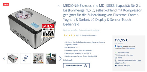 MEDION Online Shop bietet bis zum 16.07.2023 im Laufe der HEIßE PREISE - Aktion ausgewählte Artikel billiger an, solange der Vorrat reicht. Die MEDION MD 18883 2 L Eismaschine bekommt man im Laufe dieser Aktion für 199,95€ zzgl. 4,99€ Versand. Geeignet für die Zubereitung von Eiscreme, Frozen Yoghurt, Sorbet Eis-Kapazität: 2 L Füllmenge: 1,5 L Zubereitungszeit max. 60 Minuten Temperaturbereich -18 bis -35 °C Bedienung per Sensor-Touch-Bedienfeld MEDION Kunden haben diese Eismaschine für zu Hause mit 4,8 Sternen benotetet (12 Bewertungen).Eine Eismaschine lohnt sich für jeden, der oft eigene Eis-Kreationen wie Fruchteis, Veganeis uvm. zubereiten will. Auch auf einem Kindergeburtstag oder Vereinsfest wird ein selbstgemachtes Eis sehr gut ankommen.