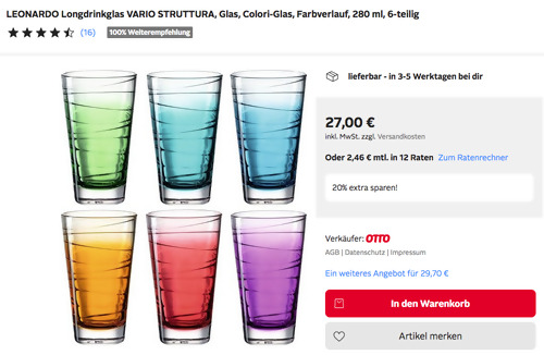 Otto.de bietet bis 26.06.2023 mit dem Gutscheincode: 13849 einen 20 % Rabatt auf ausgewählte Küchen und Haushaltswaren des Verkäufers OTTO an, solange der Vorrat reicht.Beispiel Warenkorb:Das LEONARDO Longdrinkglas VARIO STRUTTURA, Glas Colori-Glas Farbverlauf 6er Set bekommt man im Laufe dieser Aktion für 21,60€ zzgl. 2,95€ Versand. Trinkglas, 6 Stück sortiert Aus Glas Hohe Qualität dank Colori Optik: Farbverlauf Fassungsvermögen: 280 ml Höhe: 13 cm Breite: 8 cm Spülmaschinenfest OTTO Kunden haben diese hochwertigen schönen Gläser mit 4,5 Sternen benotet (16 Bewertungen).