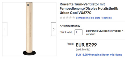Discount König bietet aktuell bei eBay den Rowenta Turmventilator Urban Cool VU6770 NEU&OVP für 87,99€ inkl. Versand an, solange der Vorrat reicht. Turmventilator mit ultraschlankem Design und Holzästhetik für moderne Wohnräume 3 einstellbare Geschwindigkeiten für einen personalisierten Kühleffekt, der an jeden Bedarf angepasst ist Ein geräuschloser Ventilator mit nur 46 dB(A) bei minimaler Drehzahl – für leisen, ungestörten Betrieb Netzkabel 1,8m Fernbedienung LED Display Timer 1-8h 86 cm hoch