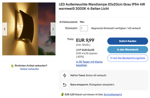 Gluehbirne-shop bietet aktuell bei eBay die Smartwares OD2-FLA-SW LED Außenleuchte Wandlampe NEU&OVP für 9,99€ inkl. Versand an, solange der Vorrat reicht. Dank dem Gutscheincode: SONNIG23 (10% Rabatt auf Garten & Terrasse) bekommt man diese Design Außenleuchte für 8,99€ inkl. Versand. 4-Seiten Licht Technik: LED Leistung: 4 W Lichtstärke / Lichtstrom: 62lm Farbe: Warmweiß Material: Aluminium Länge: 200 mm Breite: 200 mm Höhe: 60 mm Schutzart: IP54 Betriebsspannung: 230 V