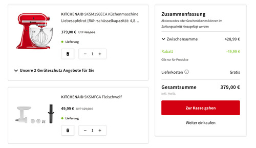 MediaMarkt bietet bis 10.04.2023, 23:59 Uhr im Laufe der Oster Marathon - Aktion ausgewählte Artikel billiger an, solange der Vorrat reicht. Die KITCHENAID 5KSM156ECA Küchenmaschine in Liebesapfelrot inkl. KITCHENAID 5KSMFGA Fleischwolf bekommt man im Laufe dieser Aktion für 39,99€ inkl. Versand. KITCHENAID 5KSM156ECA Küchenmaschine: Funktionen: Kneten, Rühren, Mischen Maximale Leistung: 300 Watt Drehzahl (min): 58 U/Min. Drehzahl (max): 220 U/Min. Gehäusematerial: Zinkdruckguss Enthaltenes Zubehör: Glasschüssel mit 4.8 Liter Inhalt, Schneebesen mit 6 Drähten, Flachrührer, Knethaken KITCHENAID 5KSMFGA Fleischwolf: Gründliches Zerkleinern von rohem Fleisch und Gemüse dank verbessertem Design Edelstahlmesser Wird mit einer feinen und einer groben Mahlscheibe geliefert inkl. Stopfer Passend für alle KitchenAid Küchenmaschinen