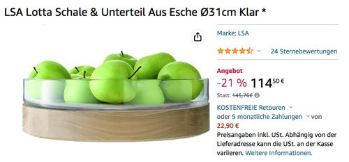 Amazon bietet aktuell ausgewähltes Geschirr & Serviergeschirr billiger an, solange der Vorrat reicht. Die LSA Ø31cm Schale "Lotta" bekommt man im Laufe dieser Aktion für 114,50€. Aus mundgeblasenem Glas gefertigt Größe: 31 cm Unterteil aus Esche
