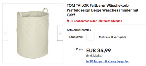 Wenko-die-bessere.idee bietet aktuell bei eBay den TOM TAILOR Faltbaren Wäschekorb in Beige NEU&OVP für 34,99€ inkl. Versand an, solange der Vorrat reicht. Wäschesammler mit Griff, freistehend Breite: 40 cm Höhe: 54 cm Waffelmuster Material: Innen- & Außenmaterial: 80% Polyester, 20% Baumwolle