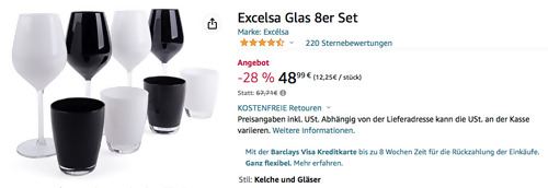 Amazon bietet aktuell ausgewählte Küchenartikel billiger an, solange der Vorrat reicht. Das Excelsa 60834 Kelche und Gläser 8er Set bekommt man im Laufe dieser Aktion für 48,99€. 4 x Rotweinglas (6 x 23 cm) 4 x Glas (8 x 9,5 cm) Material: Glas Farbe: Weiß und Schwarz Amazon Kunden haben dieses stylische Set mit 4,2 Sternen bewertet (131 Sternebewertungen).