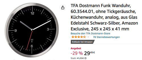 Amazon bietet aktuell ausgewählte Uhren und Wetterstationen von TFA Dostmann billiger an, solange der Vorrat reicht. Die TFA Dostmann Funk Wanduhr 60.3544.01 in Schwarz-Silber bekommt man im Laufe dieser Aktion für 29,49€. Geräuscharmes Sweep-Uhrwerk Funkübertragung Edelstahl Rahmen Abdeckung aus Glas Energiesparfunktion: Um den Batterieverbrauch zu senken, bleibt der Sekundenzeiger täglich zwischen 22h und 6h stehen Abmessungen: (L) 245 x (B) 254 x (H) 41 mm Benötigte Batterien: 1 x 1,5V AA Amazon Kunden haben diese elegante Funk-Wanduhr mit sehr guten 4,3 Sternen benotet (78 Sternebewertungen).