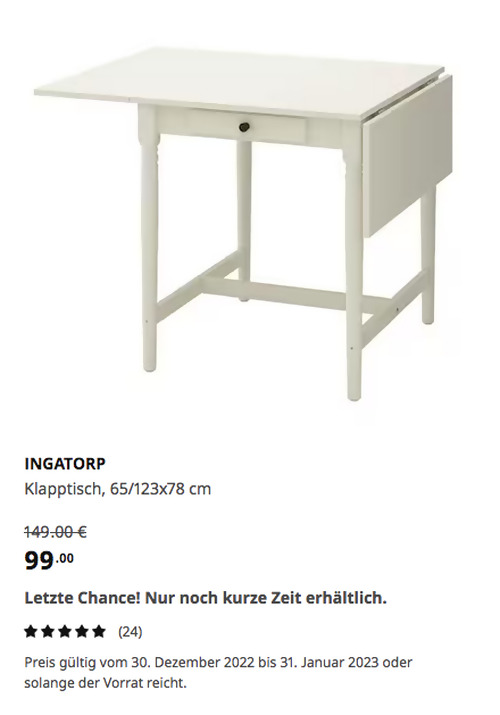 INGATORP Klapptisch, 65/123x78 cm, weißAngebot gilt bis 31. Januar 2023 bei IKEA Halle/Leipzig, gilt nicht für einen Kauf über Click & Collect und solange der Vorrat reicht.
