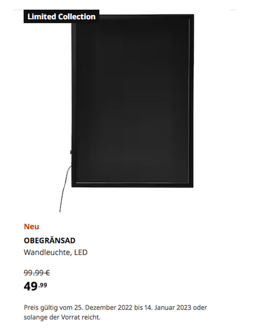 OBEGRÄNSAD Wandleuchte, LED, schwarz, 5 verschiedene Beleuchtungsprogramme, 52x36 cm, 5.0W Angebot gilt bis 14. Januar 2023 bei IKEA Kiel, gilt nicht für einen Kauf über Click & Collect und solange der Vorrat reicht.