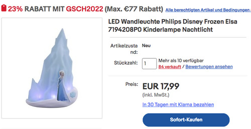 Dank dem Gutscheincode: GSCH2022 (zur Kasse gehen und dort einlösen) bekommt man bei eBay bis 18. Januar 2023 einen 23% Rabatt (max. 77€) auf ausgewählte Haushaltsartikel, solange der Vorrat reicht. Die LED Wandleuchte Philips Disney Frozen Elsa 7194208P0 bekommt man im Laufe dieser Aktion für 13,85€ inkl. Versand. Material: Kunststoff Höhe: 33,90 cm Breite: 21,20 cm Tiefe: 3,60 cm LED / fest verbaut Betrieben mit 3x AA Batterie (enthalten) Helligkeit in zwei Stufen über Schalter steuerbar Dieses niedliche Nachtlicht wurde von Amazon Kunden mit sehr guten 4,4 Sternen benotet (209 Sternebewertungen).