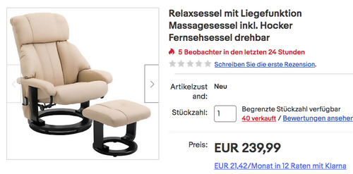 Aosom_shop bietet aktuell bei eBay den HOMCOM 700-008V02CW Relaxsessel mit Liegefunktion in Cremeweiß NEU&OVP für 239€ inkl. Versand an, solange der Vorrat reicht. 10 Schwingmassagepunkte (6 in der Rückenlehne, 2 im Sitz, 2 im Hocker) !0 Vibrationsmodi und 10 Massageintensitäten zur Auswahl Die Rückenlehne ist mechanisch stufenlos verstellbar Inklusiver praktischer Seitentasche für Zubehör, Zeitschriften und Getränke Sitzfläche: L52,5 x B53 cm Bis 150 kg belastbar Material: Kunstleder, Schaumstoff, Holz, Metall Dieser Massagesessel wurde von Amazon Kunden mit 4 Sternen bewertet (542 Sternebewertungen).