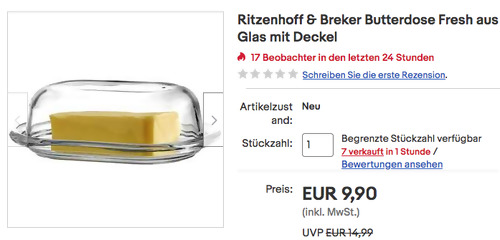 Ritzenhoffundbreker bietet aktuell bei eBay die Ritzenhoff & Breker Butterdose "Fresh" NEU&OVP für 9,90€ inkl. Versand an, solange der Vorrat reicht. Die Butterdose aus hochwertigem Glas Höhe:7 cm Diese zeitlos schöne Butterdose wurde von Amazon Kunden mit sehr guten 4,6 Sternen benotet (2016 Sternebewertungen).