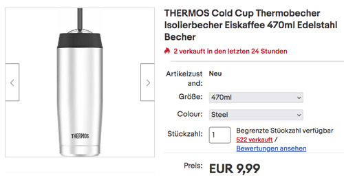 Fiducia-shop bietet aktuell bei eBay den THERMOS Cold Cup 470ml Thermobecher in Farbe Steel NEU&OVP für 9,99€ inkl. Versand an, solange der Vorrat reicht. Kapazität: 470 Milliliter Doppelwandiger Edelstahl Trinkverschluss mit Strohhalm Extra dicker Strohhalm, austauschbar BPA Frei Ideal für Smoothies, kalte Säfte, Eistee und Eiskaffee Dieser Isolier-Trinkbecher für Kaltgetränke wurde von Amazon Kunden mit sehr guten 4,5 Sternen benotet (226 Sternebewertungen).