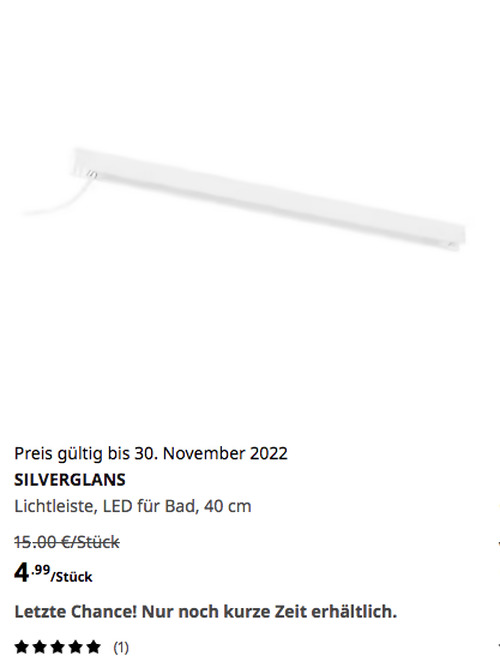 IKEA SILVERGLANS Lichtleiste, LED für Bad, dimmbar weiß, 40 cmAngebot gilt bis 30. November 2022 bei IKEA Düsseldorf, gilt nicht für einen Kauf über Click & Collect und solange der Vorrat reicht.