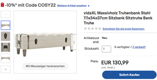 Dank dem Gutscheincode: COSY22 (zur Kasse gehen und dort einlösen) bekommt man bei eBay bis zum 19.10.2022 einen 10% Rabatt (2x einlösbar und max. 50€) auf ausgewählte Wohnartikel, solange der Vorrat reicht. Die vidaXL 245763 Massivholz Truhenbank/Sitzbank NEU&OVP bekommt man im Laufe dieser Aktion für 117,89€ inkl. Versand an, solange der Vorrat reicht. Aufbewahrungsbank ist aus massivem Tannenholz Abmessungen: 111 x 34 x 37 cm (L x B x H) Mit einer gepolsterten Sitzfläche robuste Stahlbeine Material: Tannenholz + Holzwerkstoff + Gewebe + Stahl Farbe: Cremeweiß Diese antik gestaltete Truhenbank für Flur oder Schlafzimmer wurde von Amazon Kunden mit sehr guten 4,7 Sternen benotet (9 Sternebewertungen).