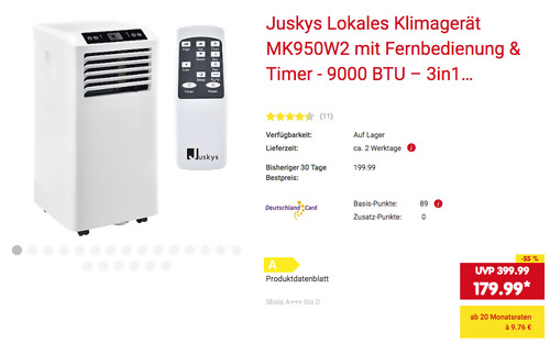 Netto Marken-Discount Onlineshop bietet aktuell aus dem Online-Magazin Juli 2022 ausgewählte Artikel billiger an, solange der Vorrat reicht. Das Juskys MK950W2 Klimagerät - ein mobiles Klimagerät mit Abluftschlauch - bekommt man im Laufe dieser Aktion für 179,99€ inkl. Versand. Lokales Klimagerät mit 2,6 kW Kühlleistung Kühlt Temperatur zwischen 16° C und 32° C runter Besitzt auch Entfeuchter-, Ventilations- & Schlaffunktion Luftstrom in 2 Geschwindigkeiten einstellbar Abluftschlauch für Entlüftung nach Außen LED Bedienfeld, Fernbedienung, Timer