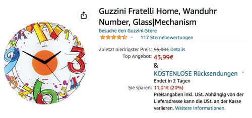 Amazon bietet aktuell ausgewählte Haushaltsartikel von Guzzini billiger an, solange der Vorrat reicht. Die Guzzini 2727 Wanduhr "Number" bekommt man im Laufe dieser Aktion für 43,99€. Material: Glas Autor der Dekoration: Ugo Nespolo Befestigungsart: Wandhalterung Artikelmaße L x B x H: 25 x 380 x 380 Millimeter Amazon Kunden haben diese farbenfrohe Wanduhr mit sehr guten 4,4 Sternen benotet (117 Sternebewertungen).