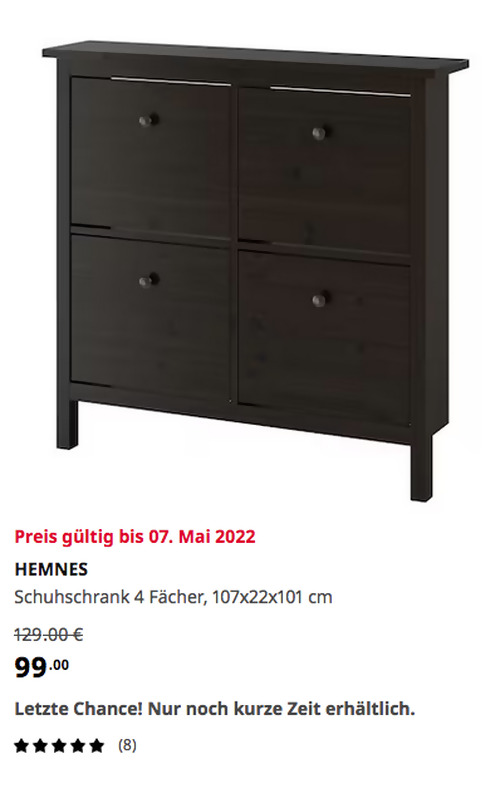 IKEA HEMNES Schuhschrank 4 Fächer, schwarzbraun, 107x22x101 cm Angebot gilt bis 07. Mai 2022 bei IKEA Kaarst, gilt nicht für einen Kauf über Click & Collect und solange der Vorrat reicht.