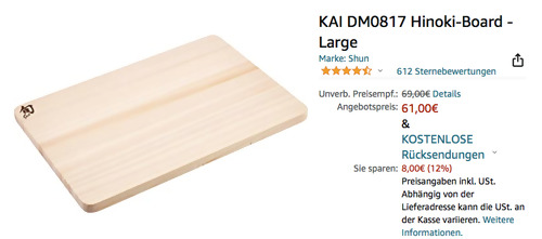 Amazon bietet aktuell ausgewähltes Küchenzubehör billiger an, solange der Vorrat reicht. Das KAI DM0817 Hinoki-Board bekommt man im Laufe dieser Aktion für 61€. Hinoki ist eine Art von japanische Zypresse) bekannt für seine Schönheit sowie seine zarte, natürliche Duft Größe: 45,7 x 30,5 x 2,0 cm Amazon Kunden haben dieses langlebige Holzbrett für Messer der Extraklasse mit sehr guten 4,5 Sternen benotet (244 Sternebewertungen).