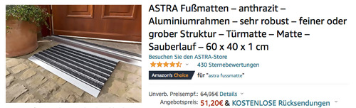 Amazon bietet aktuell ausgewählte Wohnaccessoires & Deko billiger an, solange der Vorrat reicht. Die 60 x 40 x 1 cm ASTRA 1870015001 Schmutzfangmatte Elegant Mat Scraper mit Aluminiumrahmen bekommt man im Laufe dieser Aktion für 51,20€. Größe: 40x60cm mit der Höhe von 1 cm Scraper - gröbere Textur mit Anlaufkanten 100% Aluminiumrahmen 100% Polypropylen Nutzschicht Amazon Kunden haben diese hochwertige Fussmatte für den Außenbereich mit sehr guten 4,6 Sternen benotet (279 Sternebewertungen).