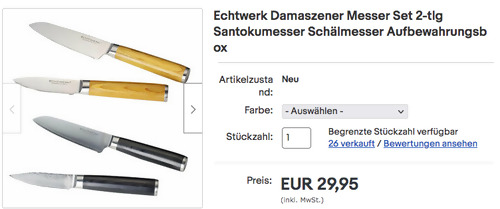 Deltatecc-home bietet aktuell bei eBay das 2-teilige Echtwerk EW-DM-0355 Damaszener Messer-Set in Schwarz oder Hellbraun NEU&OVP für 29,95€ inkl. Versand an, solange der Vorrat reicht. Santokumesser ca. 13cm Schälmesser ca. 8cm Damast-Stahl mit 67 Lagen Korrosionsbeständig Ergonomischer Griff aus Pakka-Holz Herstellernummer: EW-DM-0355 Dieses scharfe Messer-Set wurde von Amazon Kunden mit sehr guten 4,3 Sternen benotet (2 Sternebewertungen).