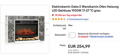 Klarstein.deutschland bietet aktuell den Klarstein HTR9-VulsiniNightfal Elektrokamin NEU&OVP für 254,99€ inkl. Versand an, solange der Vorrat reicht. Maße: ca. 106 x 72 x 28 cm (BxHxT) Temperatureinstellung zwischen 17 °C und 27 °C 1700 oder 1900 Watt Heizleistung - ideal für Räume bis 38 m² Einstellbarer Timer - 30 Minuten bis zu 9 Stunden LED Flammenillusion Fernbedienung Stauraum durch seitliche Regale MDF-Platten / Folie mit Stein- und Holzoptik Stromversorgung: 220-240 V ~ 50 Hz Dieser funktionale Elektrokamin mit Stauraum wurde von Amazon Kunden mit 4,2 Sternen bewertet (15 Sternebewertungen).